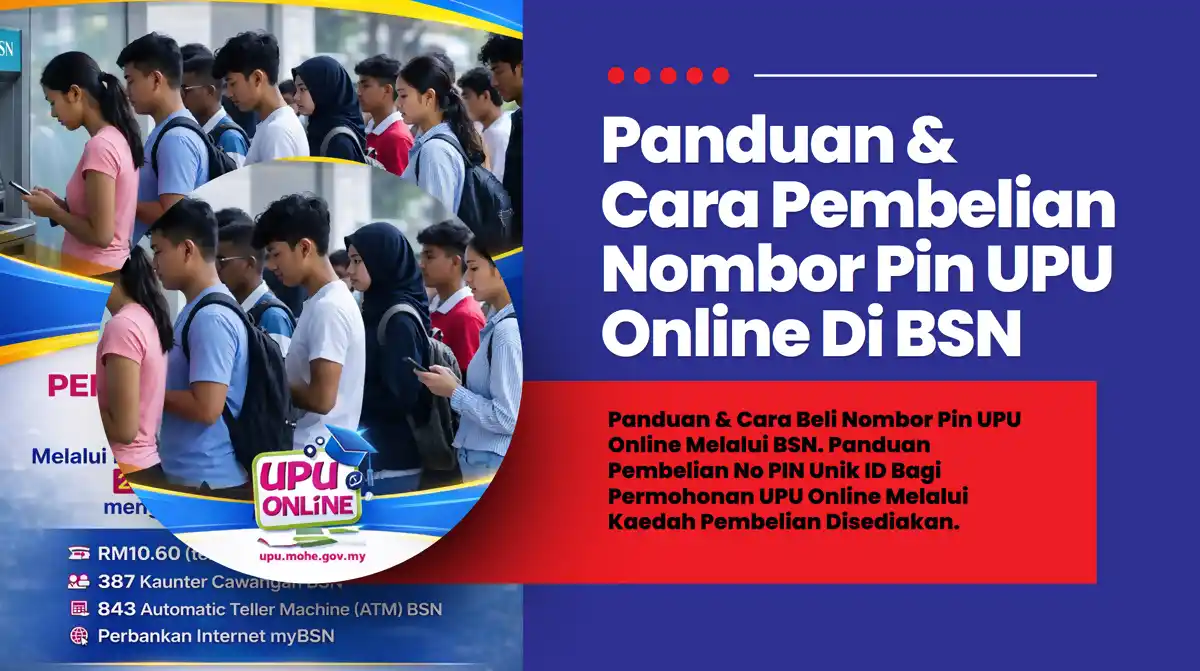 Pelajar yang berhasrat melanjutkan pengajian ke Institusi pengajian tinggi awam (IPTA) bagi permohonan kemasukan ke Universiti Awam (UA), Politeknik, Kolej Komuniti (KK) Dan MARA Bahagian Pendidikan Tinggi (MARA BPT) sesi akademik 2026/2027 perlu membuat pembelian nombor PIN UPU online melalui Bank Simpanan Nasional (BSN) bagi membolehkan sistem borang permohonan dalam talian dapat diakses sepenuhnya.