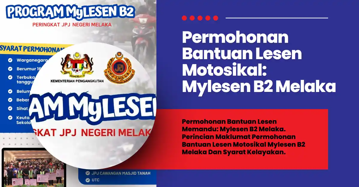 Jabatan Pengangkutan Jalan (JPJ) Melaka membuka permohonan Program MyLesen B2 Tahun 2026. Program ini menawarkan bantuan kepada golongan B40 dan tanggungan mereka memperoleh Lesen Memandu Malaysia (LMM) Kelas B2, khususnya untuk motosikal berkapasiti tidak melebihi 250 cc.